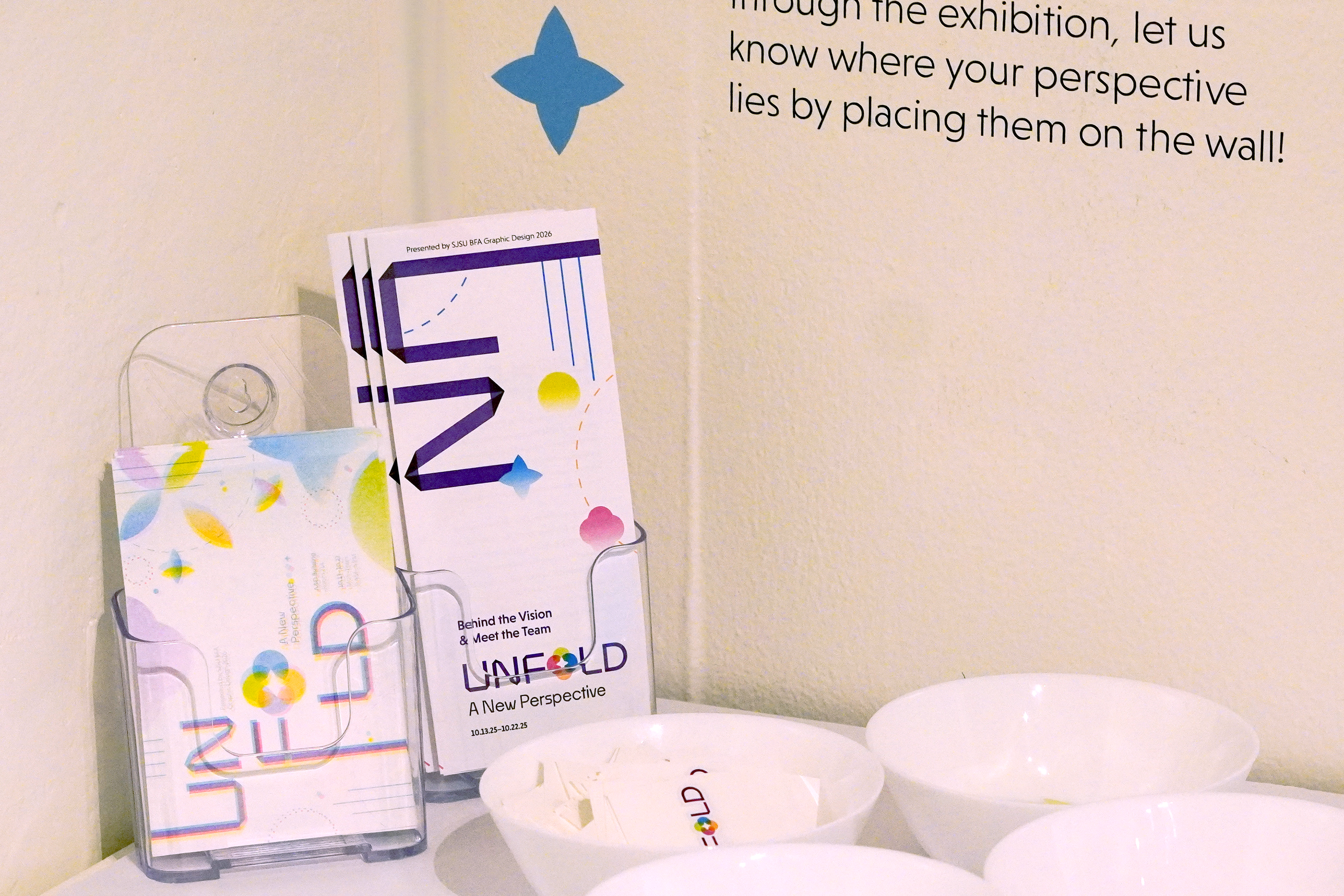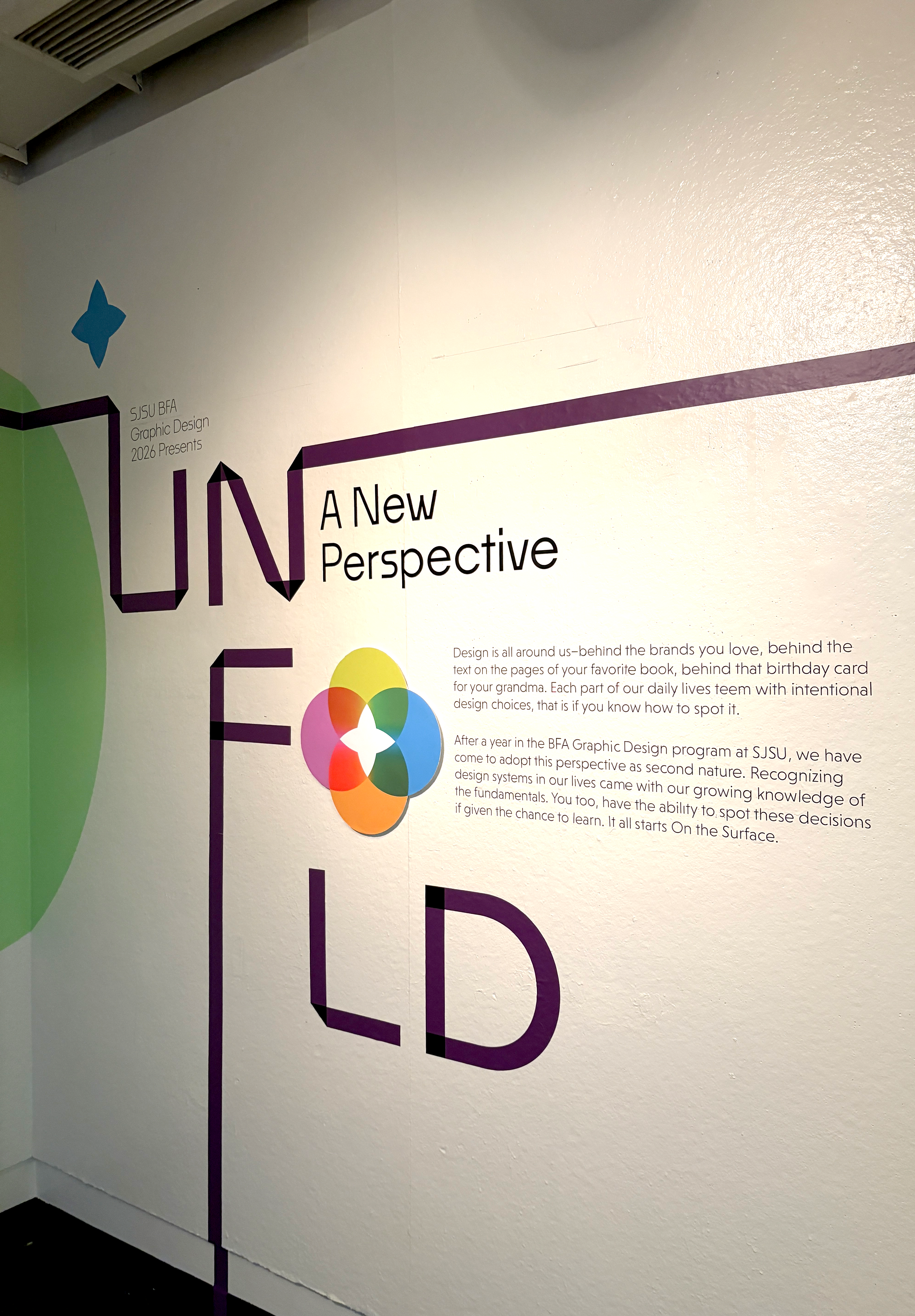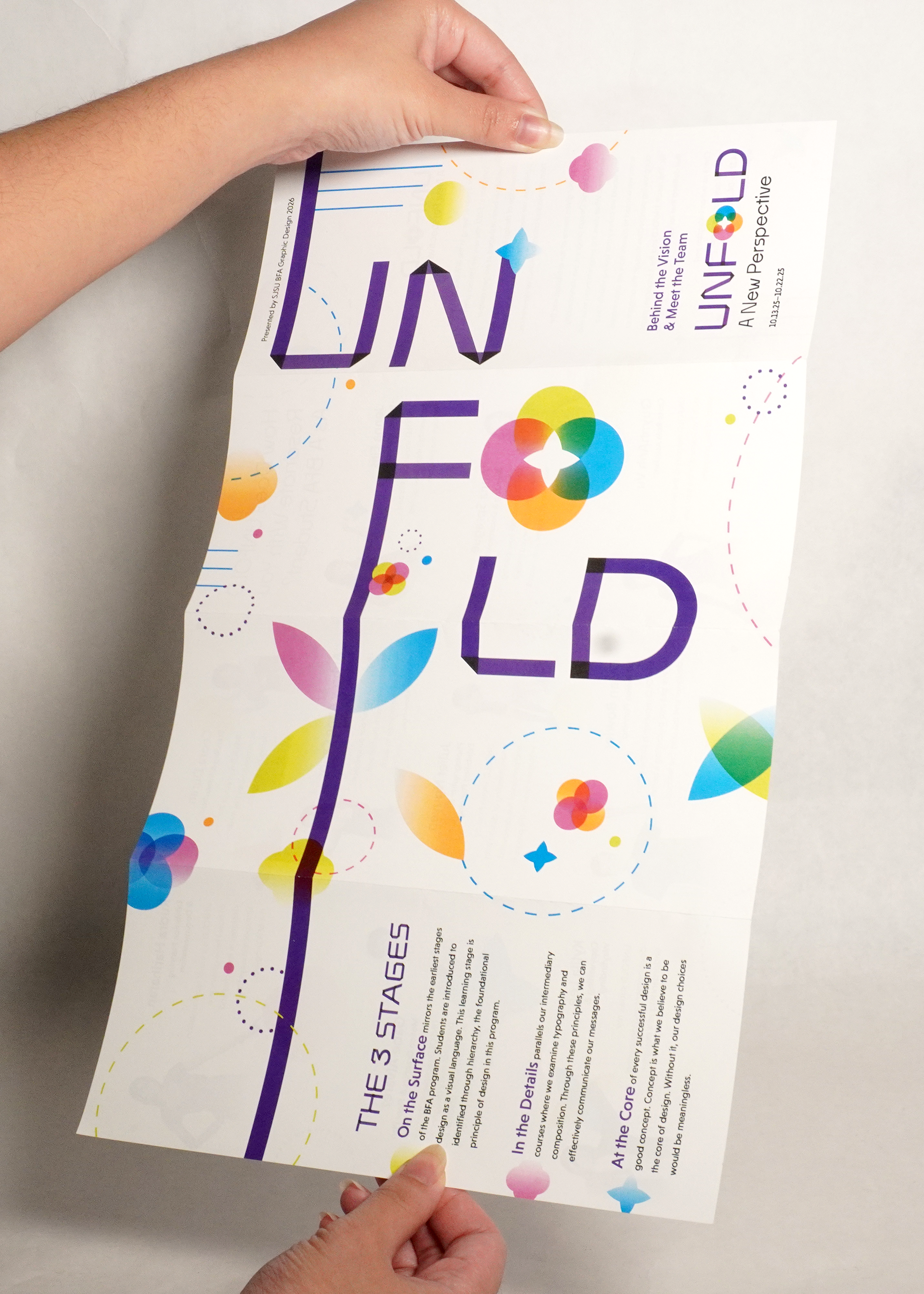 An exhibition created by ten graphic design students at San José State University, Unfold breaks the BFA Graphic Design experience into three stages: